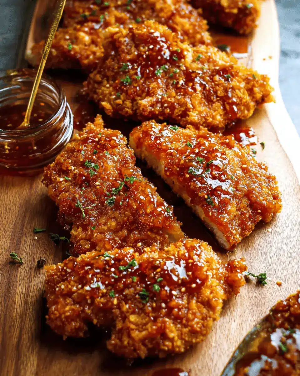 Spice things up with a spicy garlic twist on your Baked Crunchy Hot Honey Chicken! Simply add 1-2 tablespoons of minced garlic and an extra dash of cayenne pepper to the coating mixture. For an added kick, mix in a bit more hot sauce to your honey glaze. This not only enhances the flavor but also turns up the heat to satisfy your spicy cravings. Pair it with a cool yogurt dip to balance out the heat.