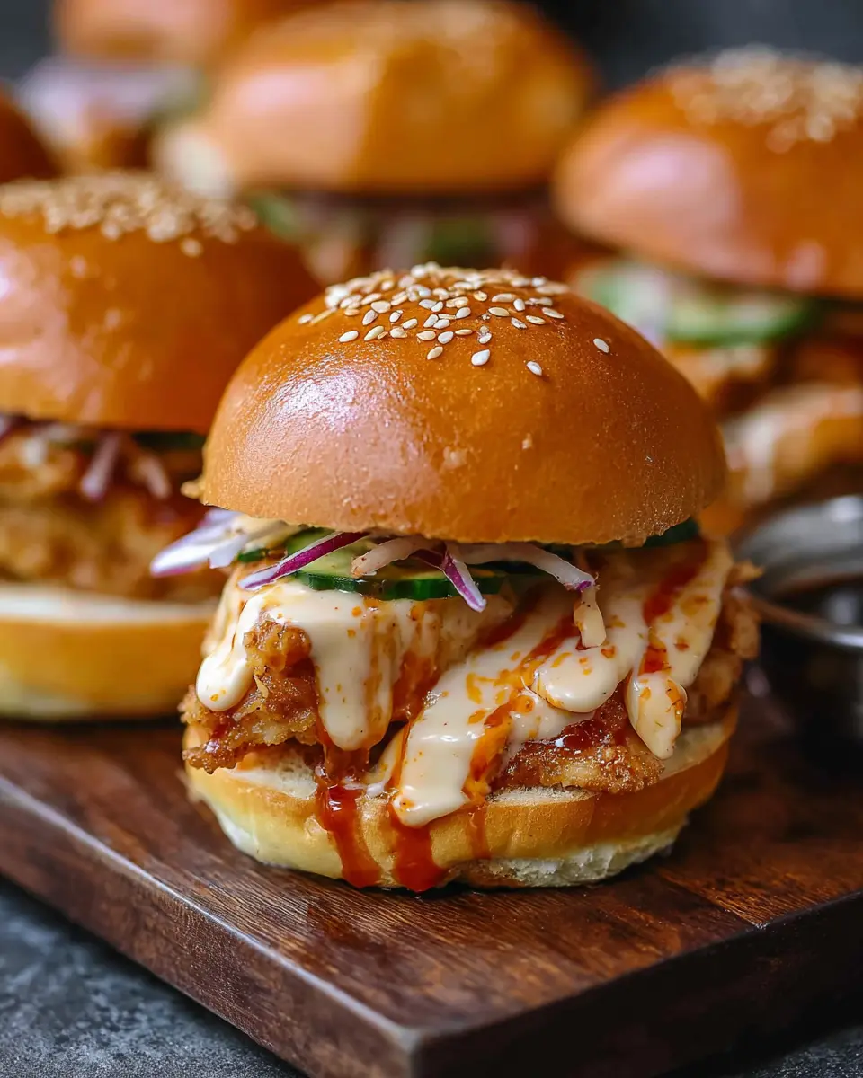 Now comes the fun part! Take the fried chicken cutlets and slice them into slider-sized pieces. Place each piece onto a slider roll and top with a slice of mozzarella cheese while they’re still warm—this will melt the cheese perfectly. Drizzle generously with your homemade Bang Bang Sauce, and there you have it: glorious Bang Bang Chicken Sliders ready to be devoured!