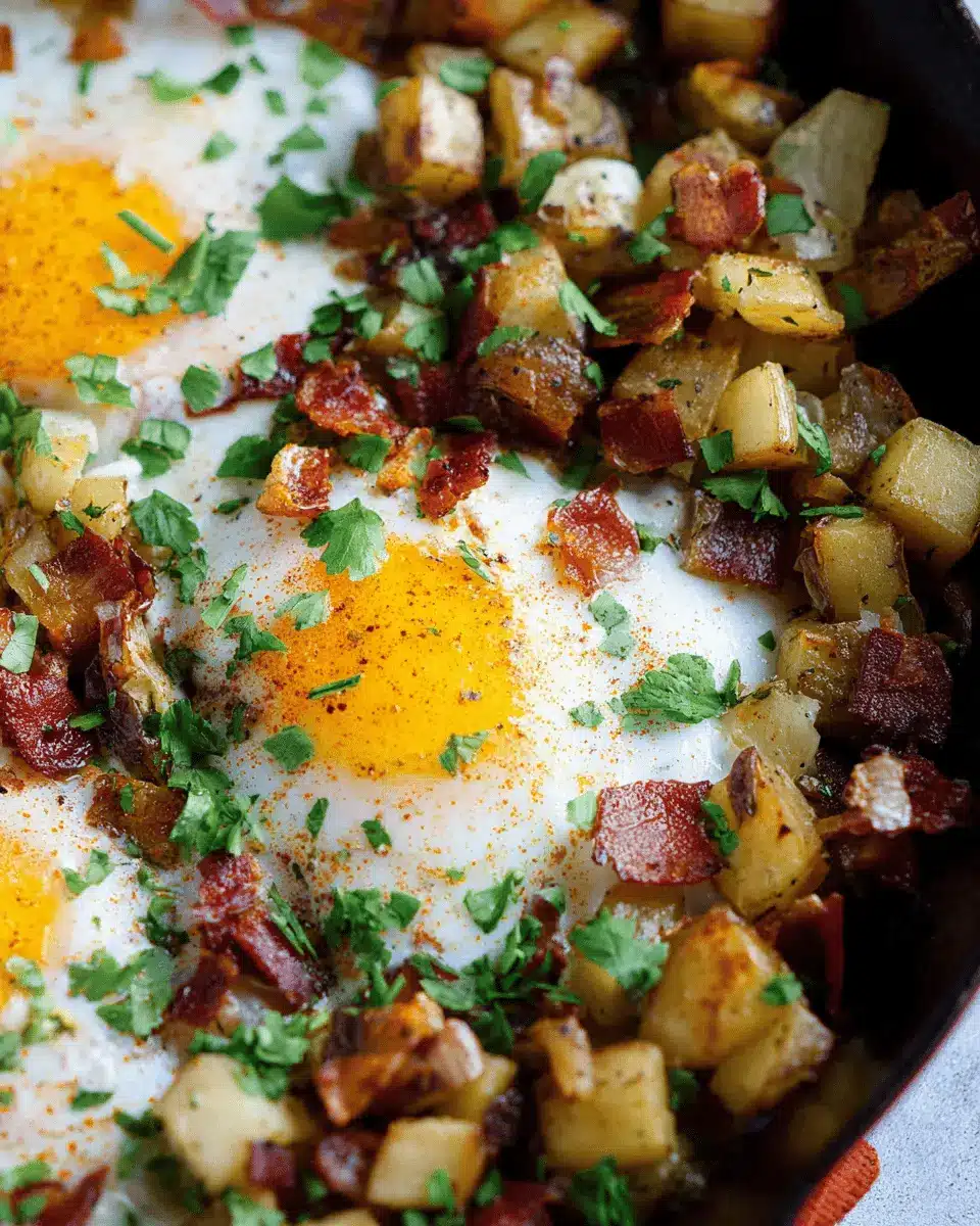 When your eggs are cooked to perfection, remove the lid and sprinkle the crispy turkey bacon on top to warm it back up. For a vibrant finish, garnish with fresh cilantro for an extra punch of flavor. Serve your breakfast potato hash with eggs hot and enjoy the smile it brings to your breakfast table! Whether it's a cozy Sunday or a busy Monday morning, this dish is bound to leave you satisfied and ready to take on the day.