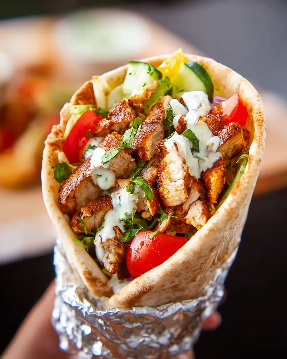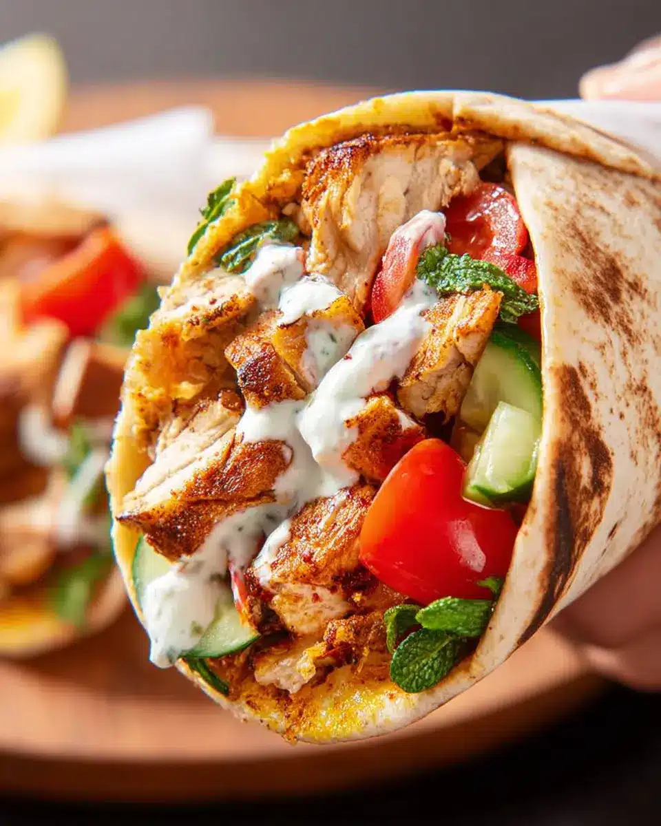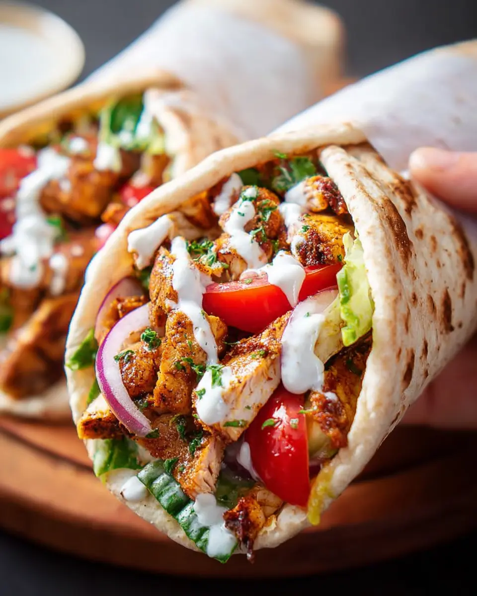 It’s time to bring everything together! Warm some pitas and layer them with your sliced chicken and roasted onions. Top them off with crisp chopped romaine, halved cherry tomatoes, cucumber slices, and a generous drizzle of your yogurt sauce.