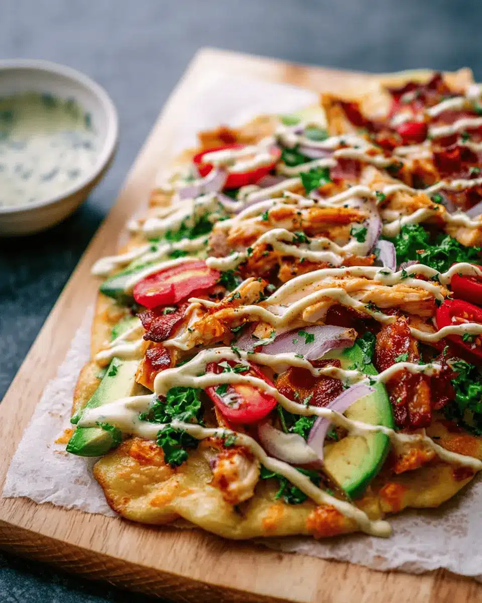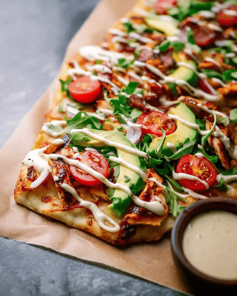 Now comes the fun part! Before serving, pile on the fresh toppings: one cup of shredded iceberg lettuce, halved cherry tomatoes, sliced avocado, and crumbled turkey bacon. The colors will pop, making this Chipotle Chicken Flatbread not just delicious but visually appealing too.