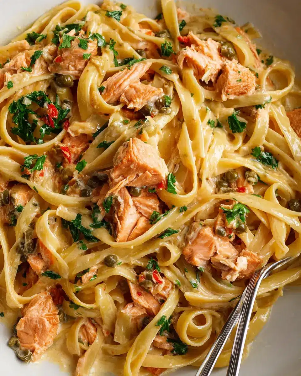 Serve your creamy salmon pasta topped with flaky salmon pieces, a sprinkle of lemon zest, and fresh herbs like chives or dill for an extra burst of flavor. This recipe is sure to quickly become a favorite in your household!