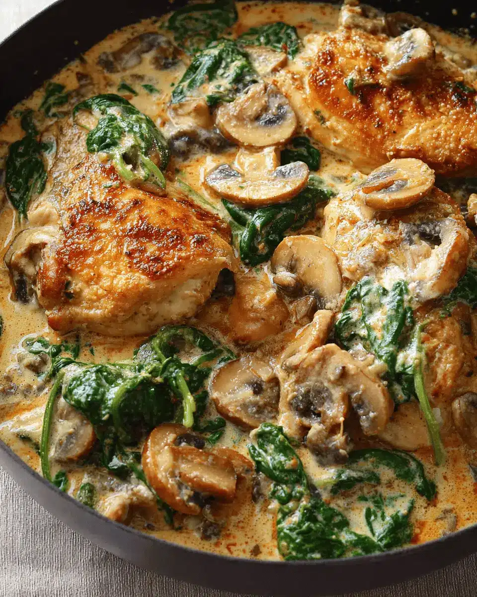 To ensure your creamy spinach and mushrooms chicken turns out luxuriously smooth, use full-fat heavy cream. This not only enhances the richness but also prevents the sauce from becoming too thin. When cooking the chicken, don’t rush! Allow it to get a nice golden-brown sear, which adds depth to the flavor. Lastly, be gentle when you stir the spinach and mushrooms; you want them to meld into the sauce without losing their texture.
