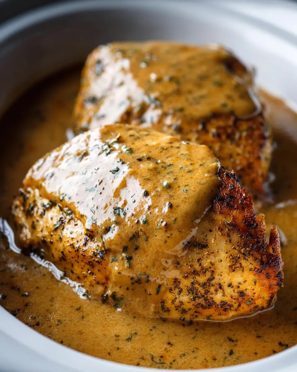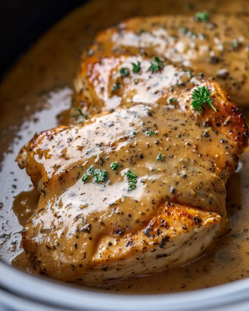 Next, take those boneless skinless chicken breasts and gently place them into the pot. Make sure they’re submerged in the gravy mixture. This is where the magic happens—the sauce will keep the chicken moist while infusing it with delicious flavors.