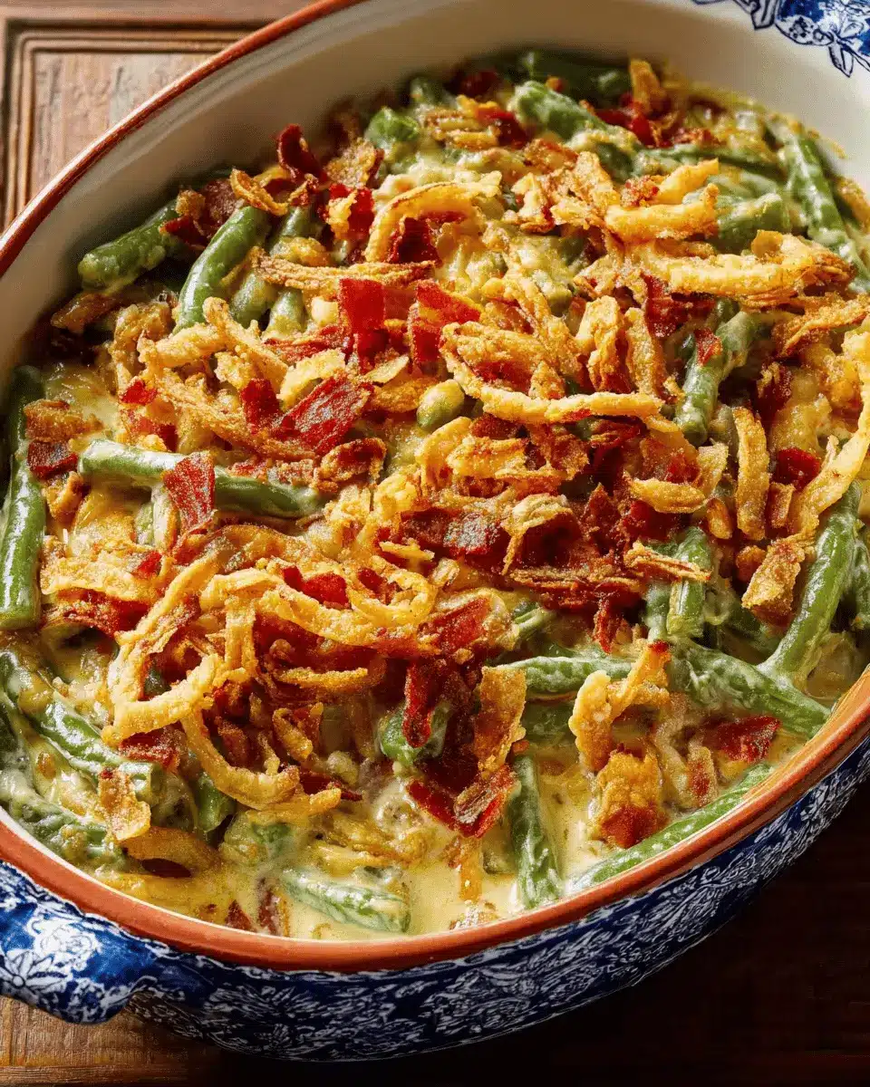 After the first bake, it’s time to take it to the next level. Crumble your crispy turkey bacon and scatter it on top of the casserole, followed by the remaining fried onions. Pop it back in the oven for another 5 minutes or until those onions are golden brown and crispy. The final result is a green bean casserole that is not just easy to make but also tantalizingly delicious.