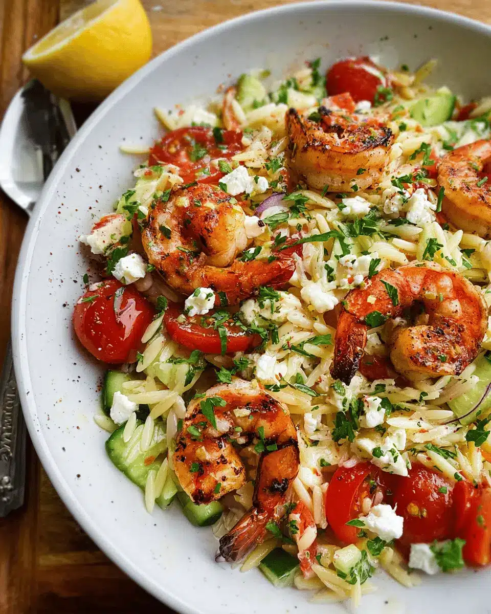 Greek Style Grilled Shrimp Orzo Pasta Salad