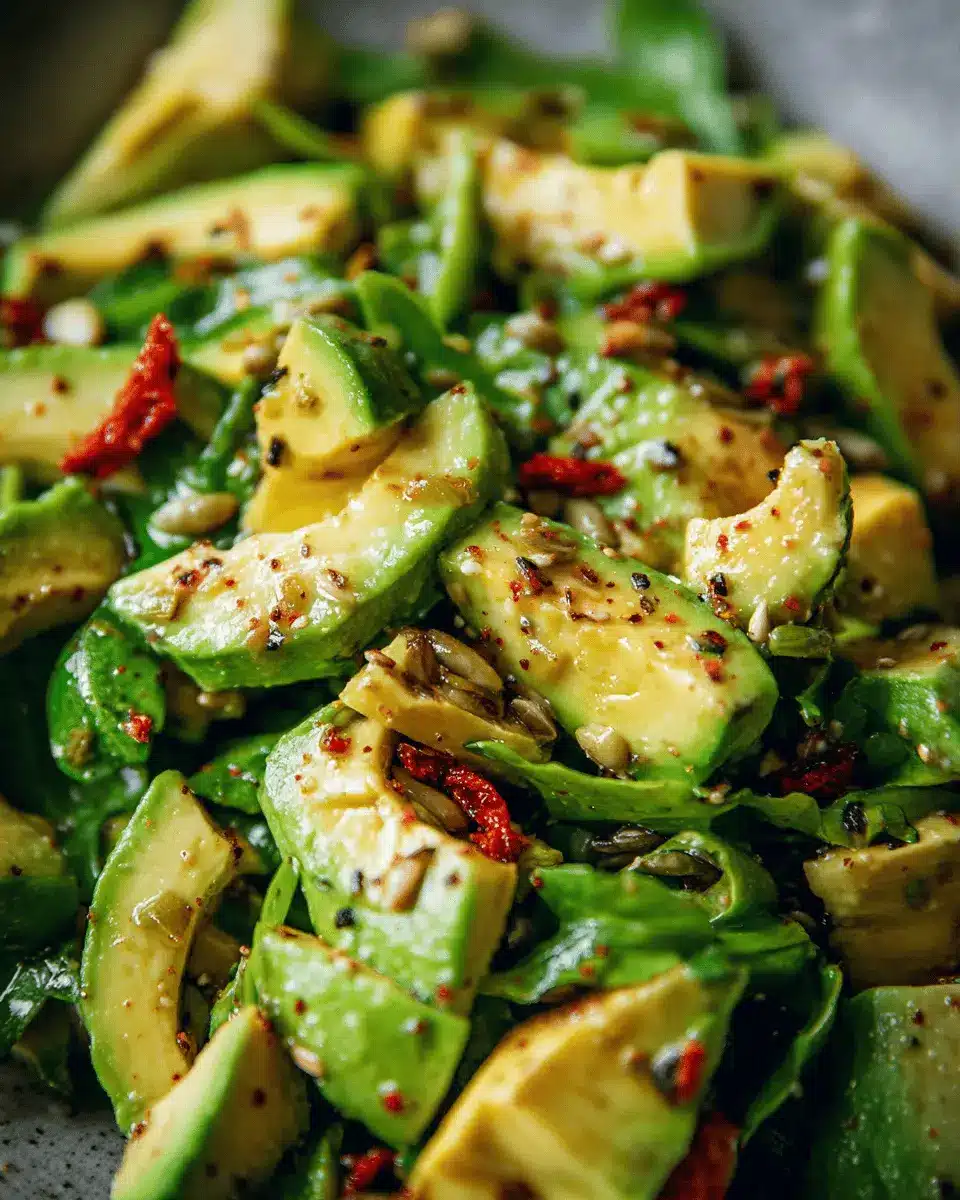 To elevate the heat level of your green avocado salad, incorporate sliced jalapeños or add a dash of hot sauce to your dressing. You could even try sprinkling some red pepper flakes on top for added flavor and heat. Don’t be shy to play around with your spice levels based on your personal taste!