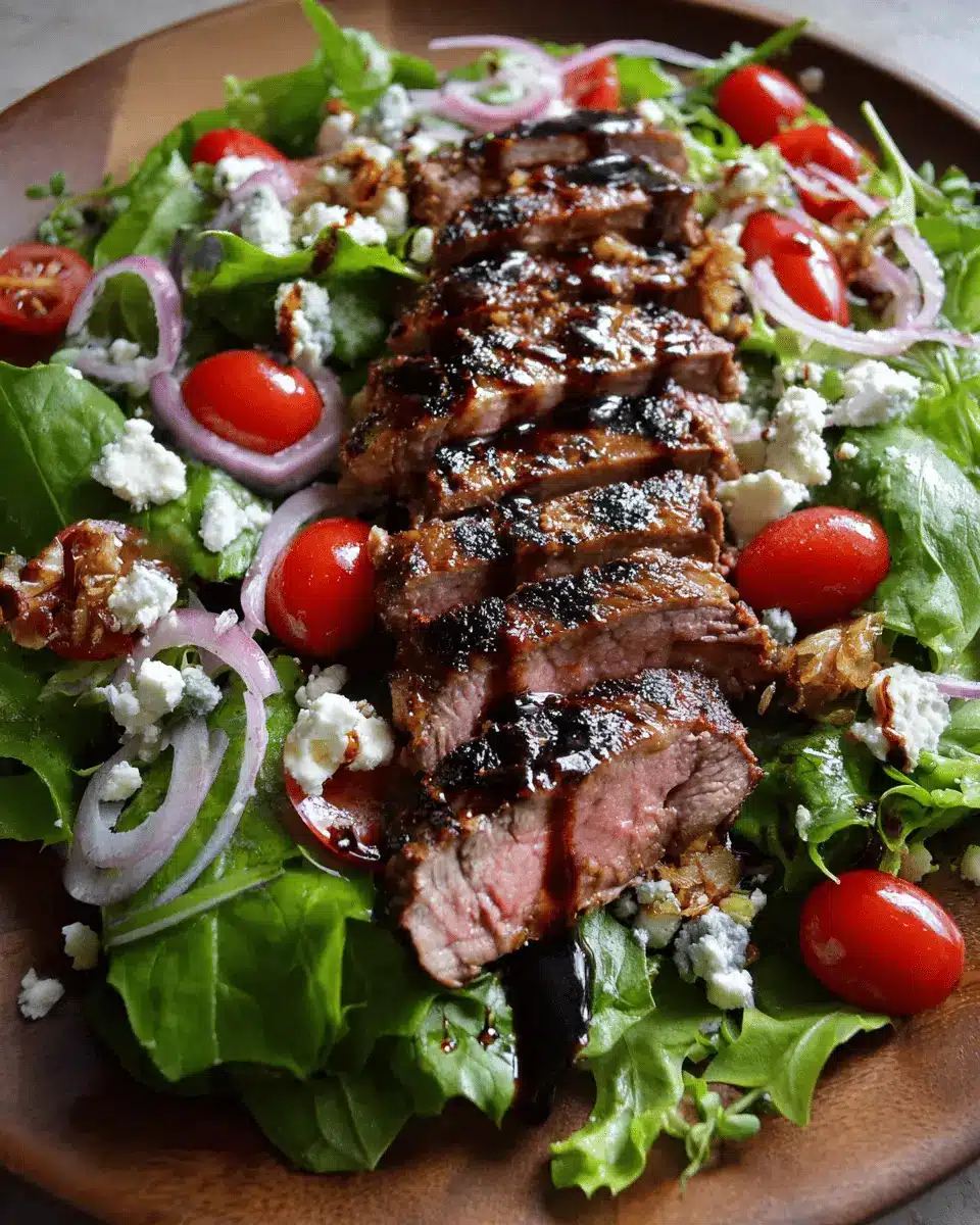 Finally, slice the grilled steak against the grain into strips and layer it beautifully on top of your salad. Don’t forget to sprinkle the crumbled cheese over everything for that burst of flavor! Drizzle your homemade balsamic dressing evenly across the top.