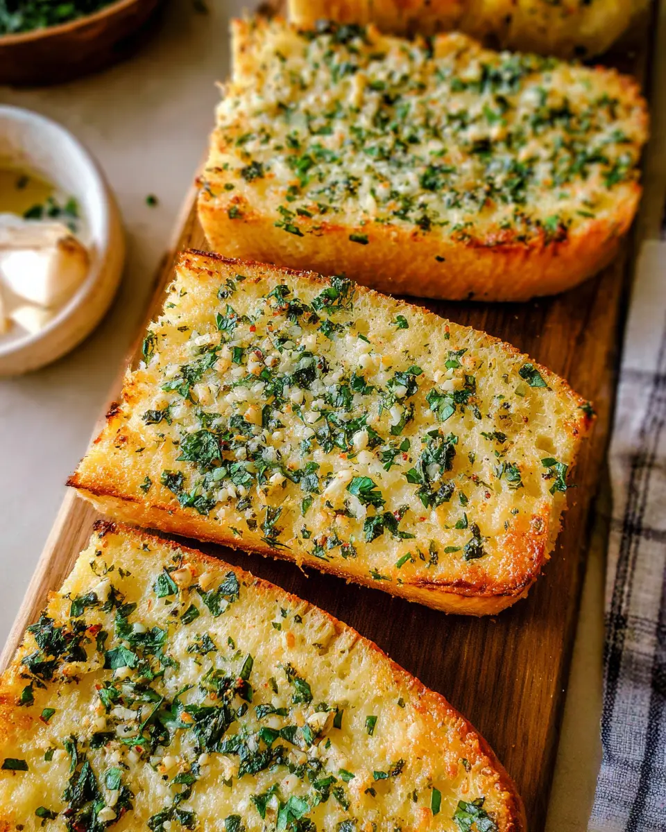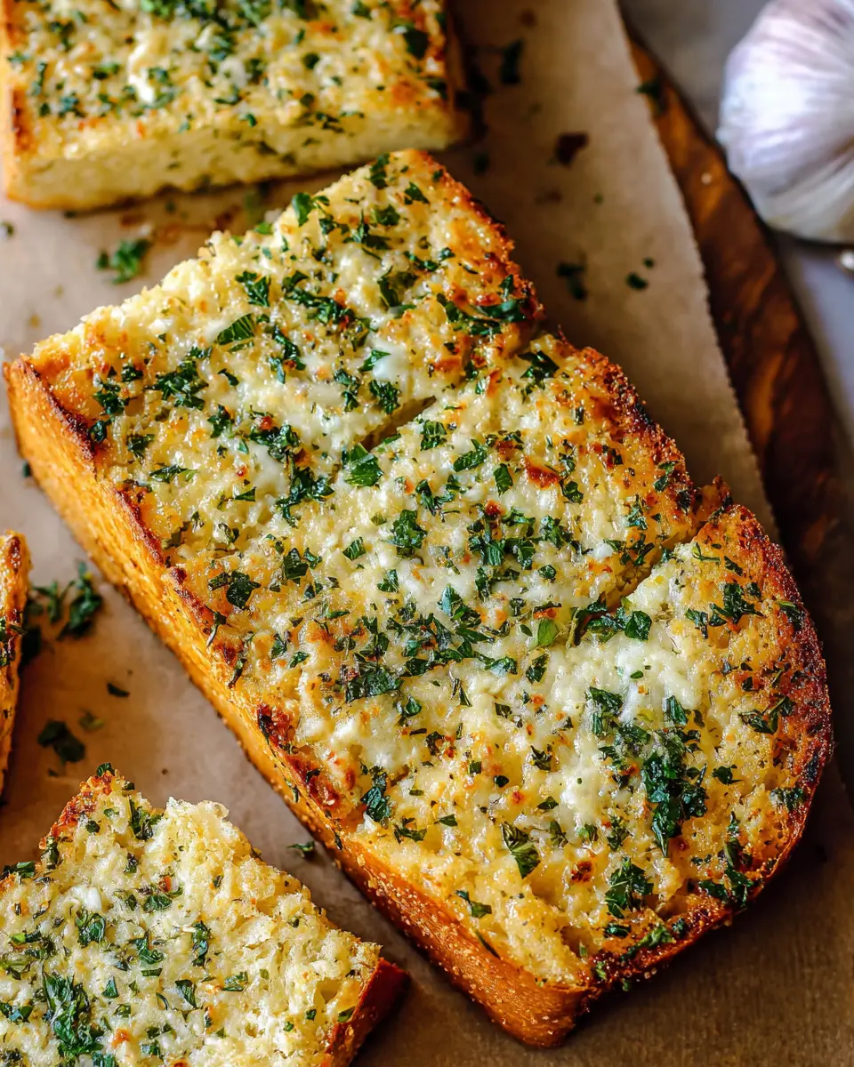 Serve homemade garlic bread alongside a warm bowl of minestrone or a fresh garden salad for a delightful meal addition. The crispy texture creates an excellent contrast to the soup's creaminess or the crunch of salad greens.