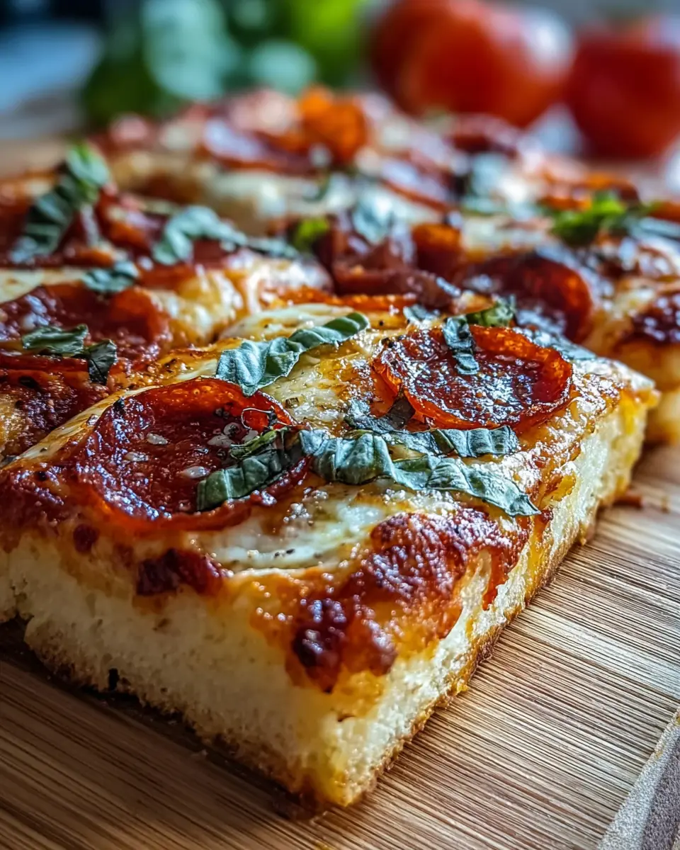 - Allow the pizza to cool for a few minutes before garnishing with fresh basil. Slice into squares and enjoy this delightful homemade creation!
