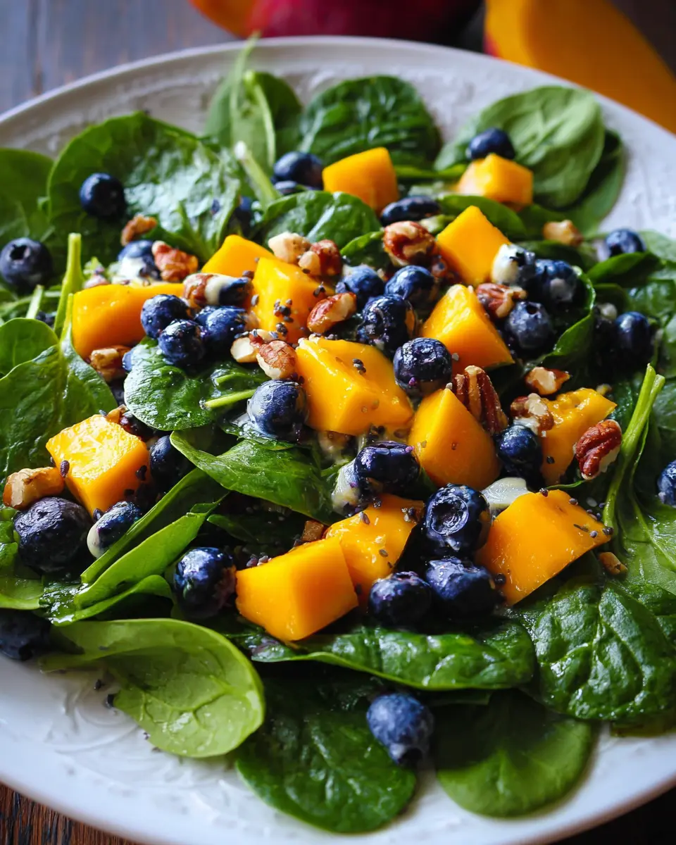 Mango Salad with Spinach and Blueberries is perfect for a variety of occasions, from casual family dinners to festive summer gatherings. It's a showstopper for picnics, brunches, and potlucks, where its bright flavors and vibrant colors will surely impress your friends and family. Imagine the compliments as they dig in! For those busy weeknights, this salad is a quick, nutritious choice that feels indulgent without the fuss.
