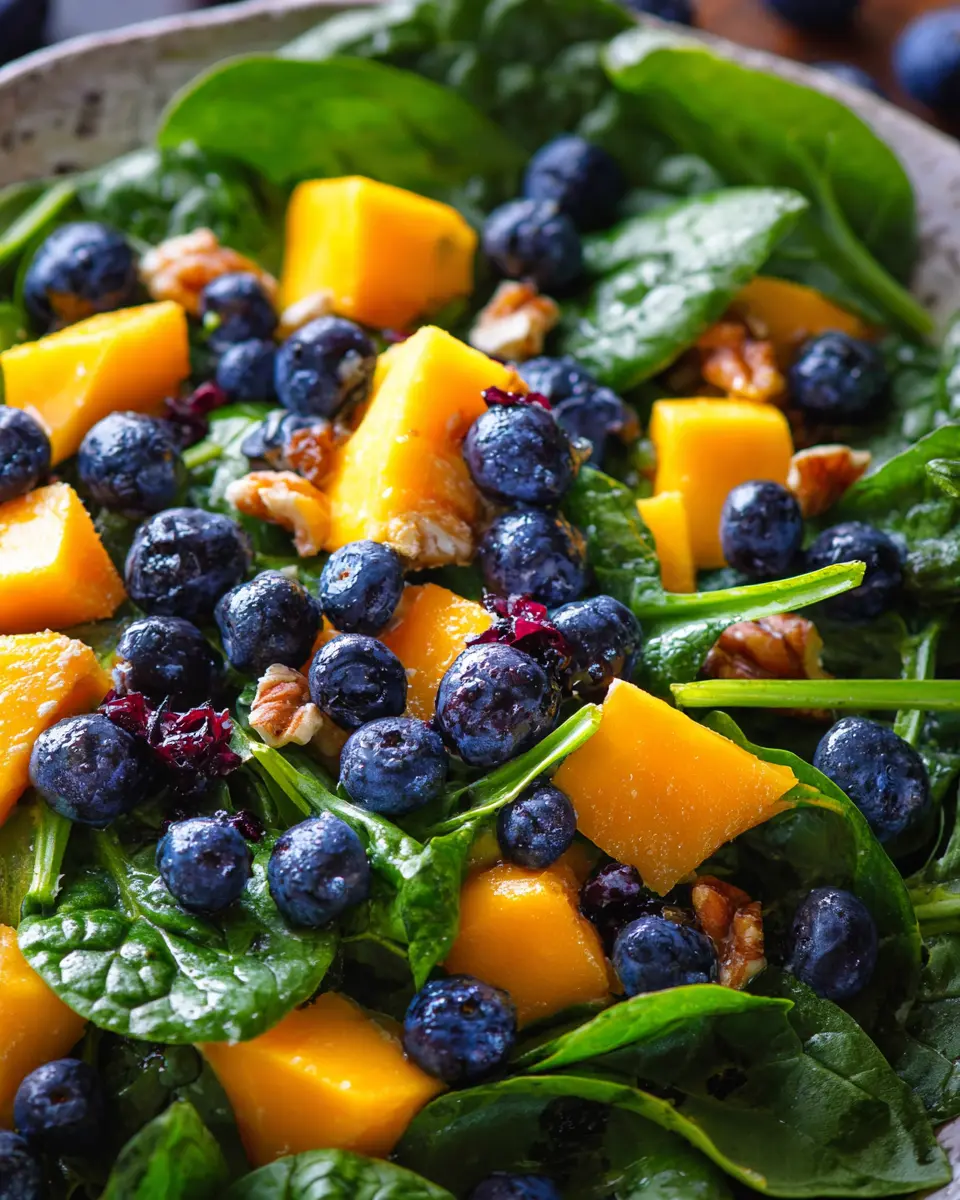 For the best flavor, enjoy your Mango Salad with Spinach and Blueberries fresh. However, if you need to store leftovers, keep them in an airtight container in the fridge for up to 2 days. Just note that the spinach might lose some of its crispness!