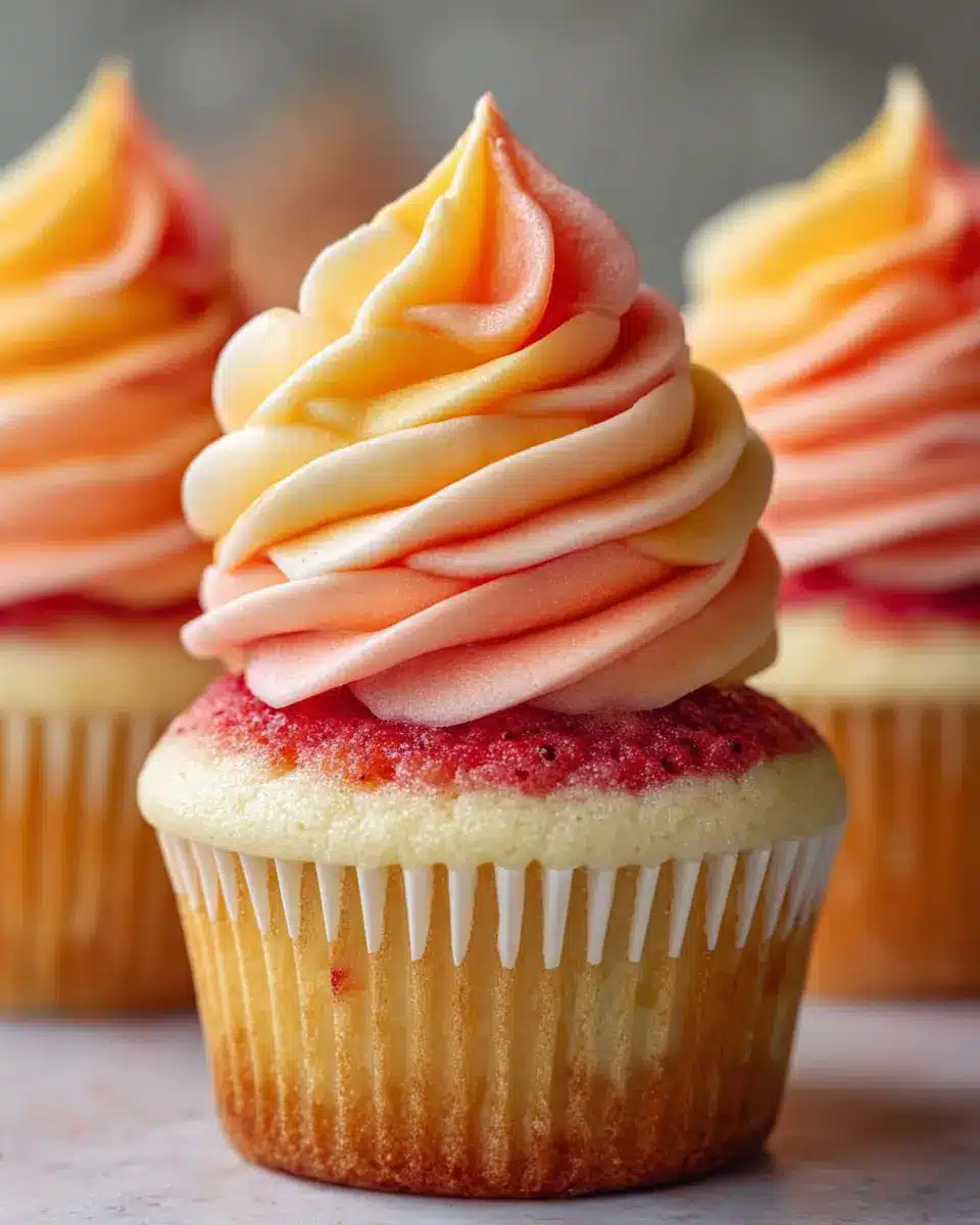 Divide the frosting into three separate bowls: one for plain, one with 2 tablespoons of mango purée for a bright hue, and the last with 2 tablespoons of strawberry purée for a rosy finish. Use these colors to pipe a beautiful swirl atop each cupcake, bringing your Mango Strawberry Sunset Cupcakes Recipe to life!