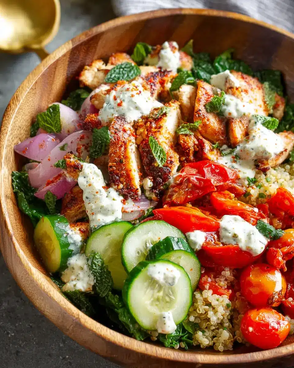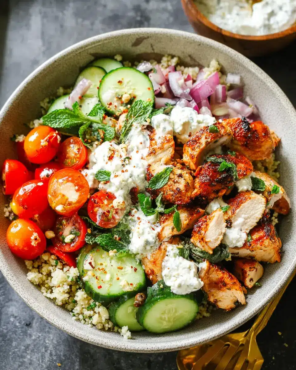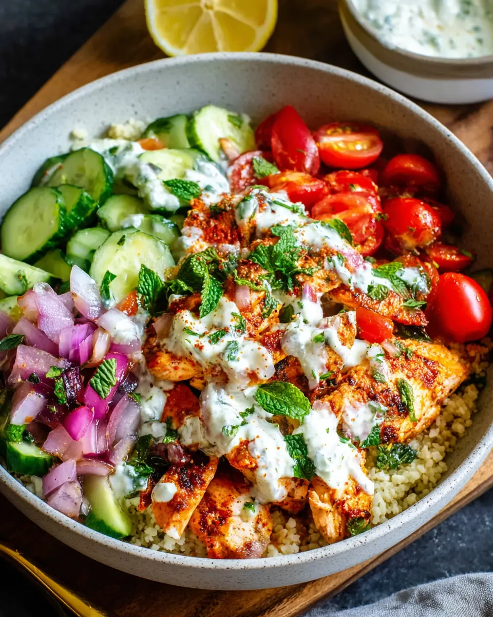 In summary, Mediterranean Chicken Bowls offer a delightful mix of flavors and textures that will elevate your lunch or dinner. With the sweet, spicy harissa honey chicken paired with fresh veggies and creamy tzatziki, it’s both nourishing and satisfying. Enjoy this vibrant dish for a delicious taste of the Mediterranean!