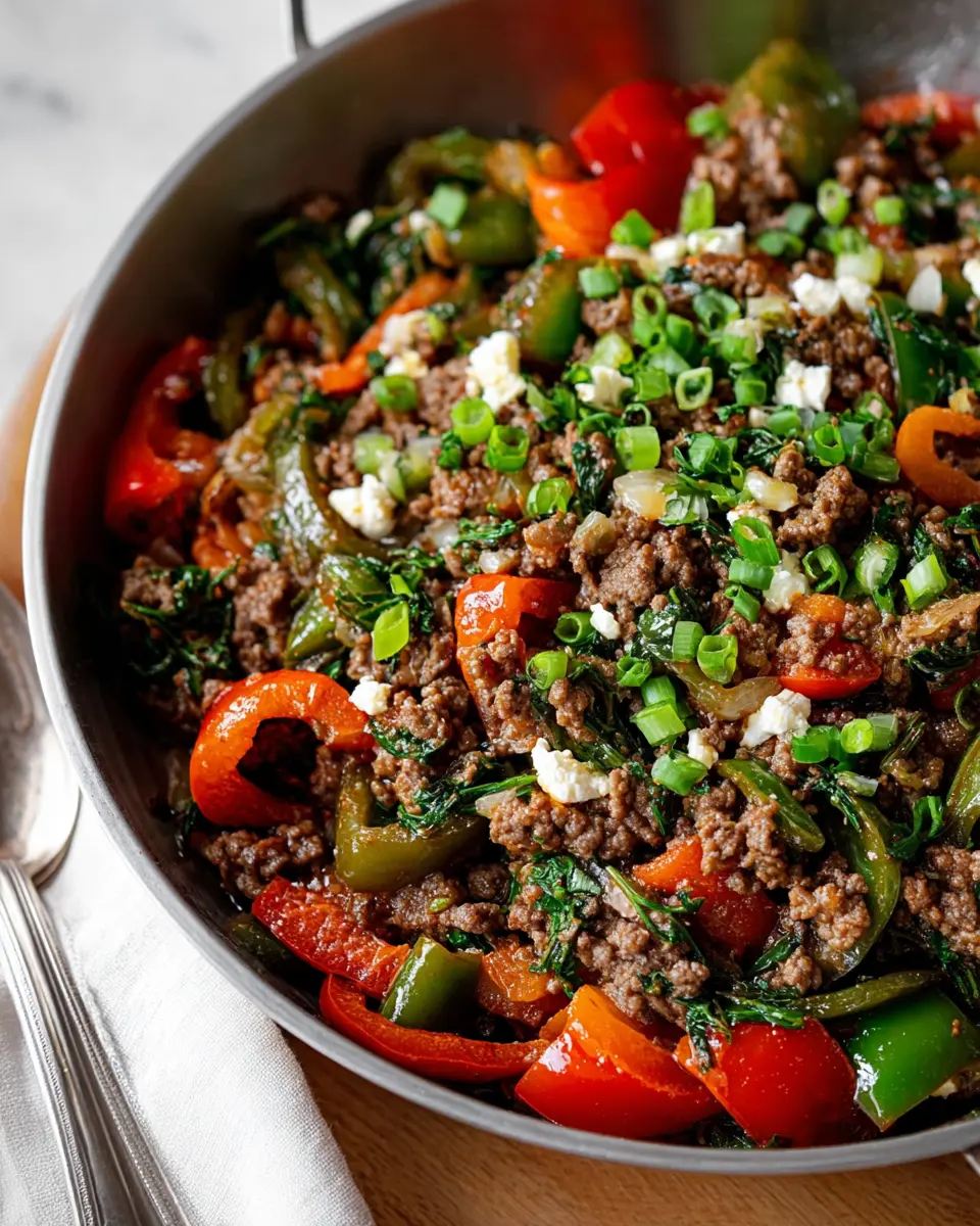 To finish off your Mediterranean Ground Beef Stir Fry, consider garnishing with 2 tablespoons of crumbled feta cheese. Not only will this add a beautiful presentation, but it will also elevate the flavors to a whole new level. Finally, serve your dish warm, allowing everyone to dive into this wholesome, colorful meal.