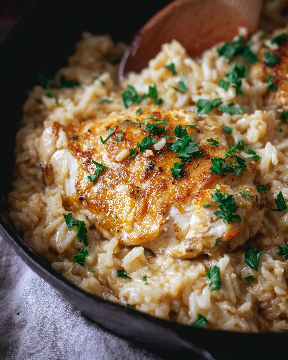 Now, let’s combine our efforts! Add two and a quarter cups of chicken broth and one cup of heavy cream to the skillet; a large pinch of salt and pepper goes in too. Stir everything together and bring it to a gentle simmer. Once bubbling, place the browned chicken back into the pan. Cover the skillet with a lid and reduce the heat to low, allowing it to cook for 25-30 minutes, or until the rice reaches the perfect softness. This step allows the chicken to cook through while infusing its flavors into the rice.