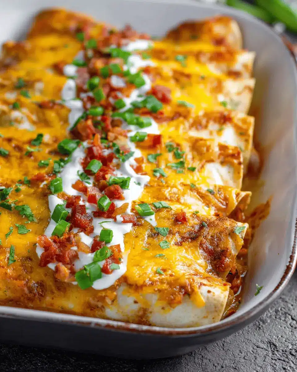 Grab those tortillas and lay them flat on a clean surface. Spoon about an eighth of your filling mixture down the center of each tortilla. Then, carefully roll them up, tucking in the sides as you go to keep that delicious filling inside. Place each rolled tortilla seam-side down in a greased 13x9-inch baking dish. Repeat until you’ve filled all your tortillas.