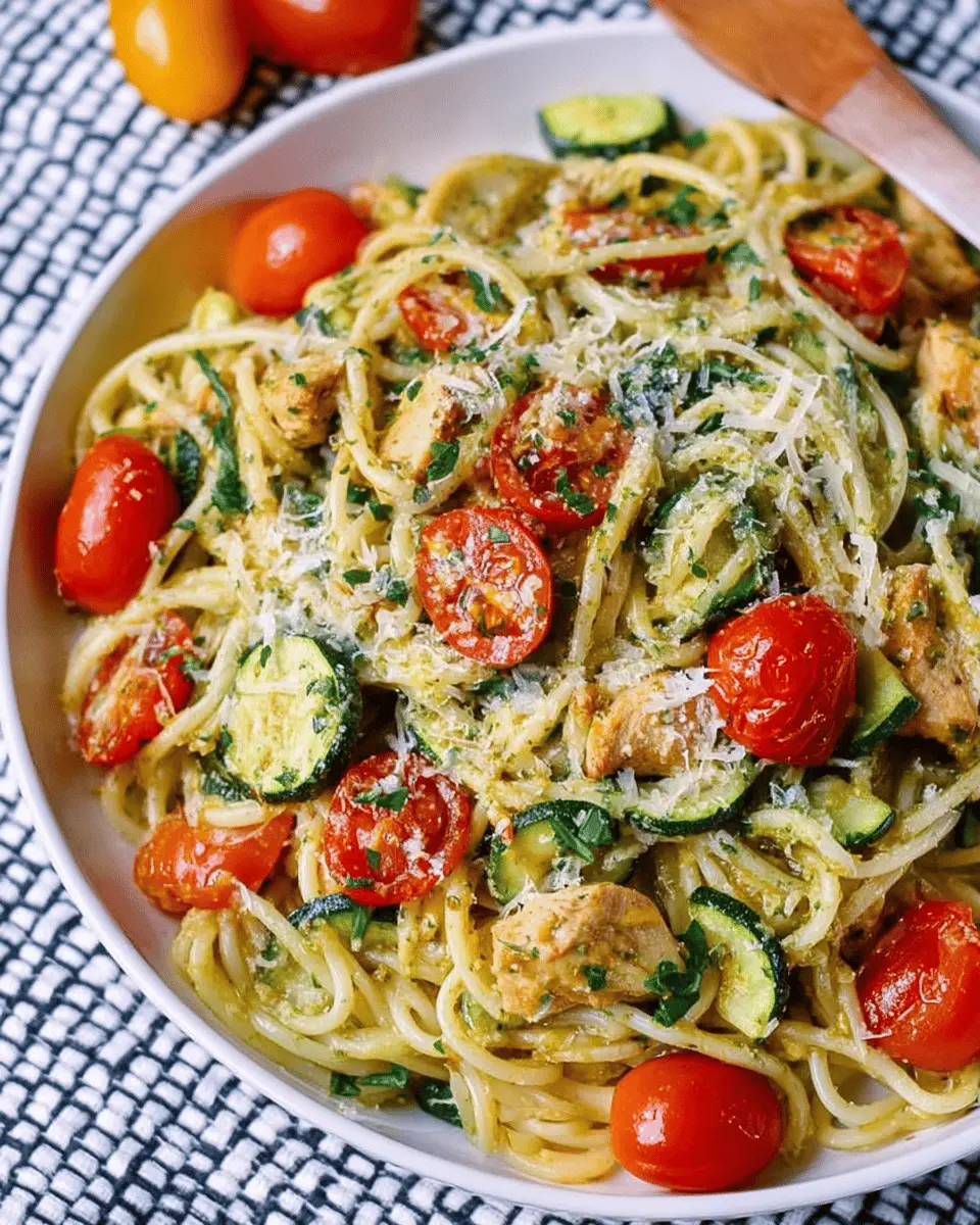 Gone are the days of relying solely on takeout or frozen meals. Studies indicate that cooking at home can not only save you money but also allows you to control the ingredients and portion sizes, contributing to better overall health (Harvard Health). This particular recipe showcases a vibrant blend of zucchini, fresh tomatoes, and tender chicken, all tossed together with a savory basil pesto and topped off with grated Parmesan cheese.