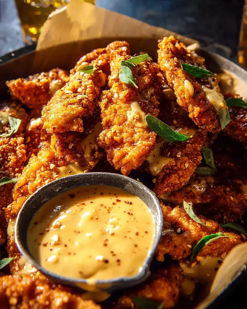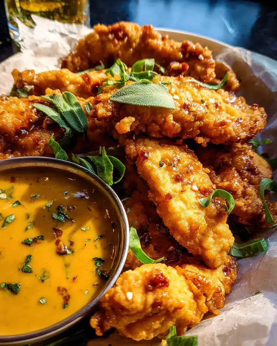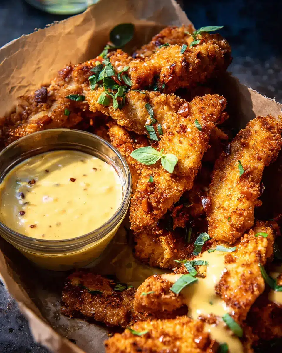 Pretzel Chicken Fingers with Spicy Honey Mustard Sauce.