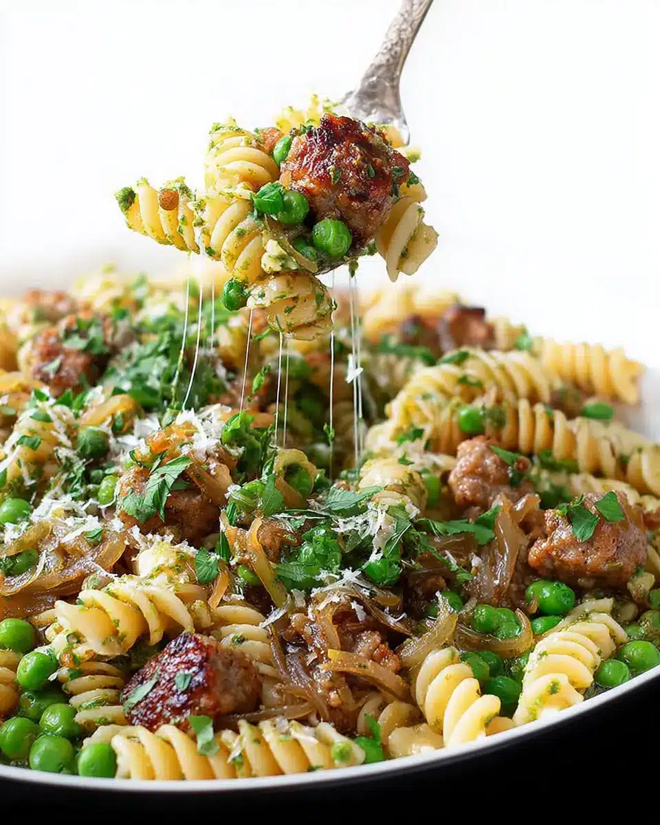 Sausage Pesto Pasta with Caramelized Onions and Peas