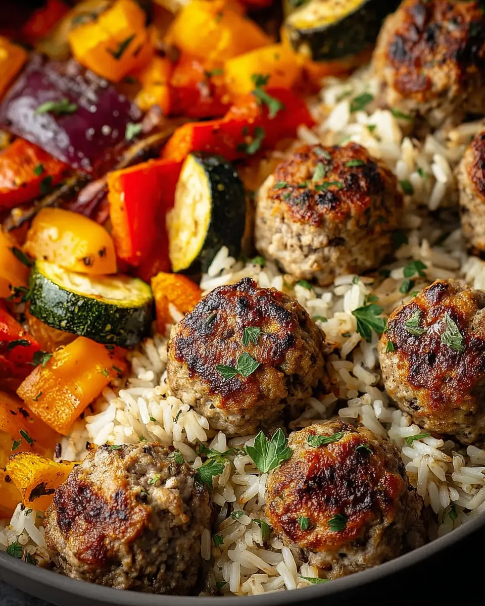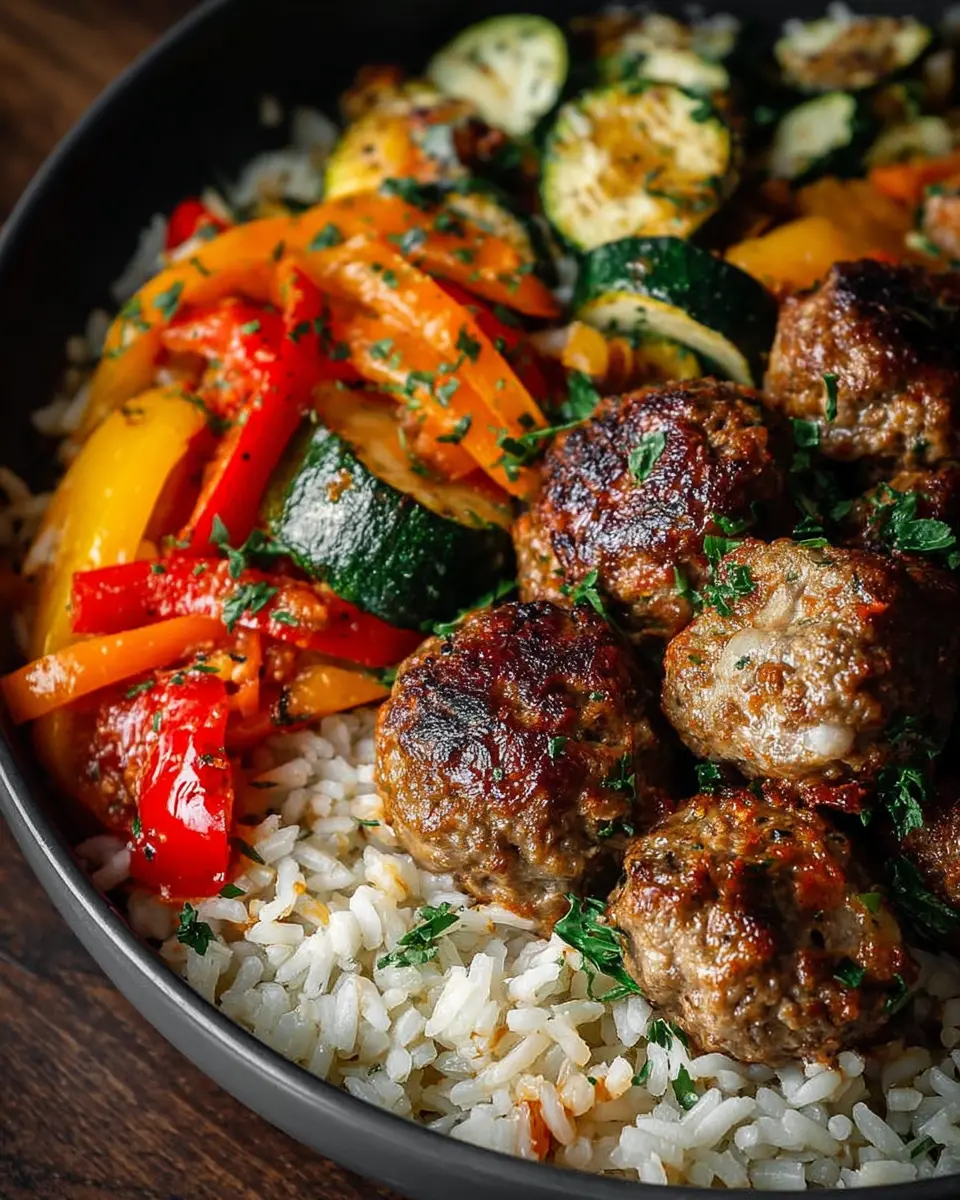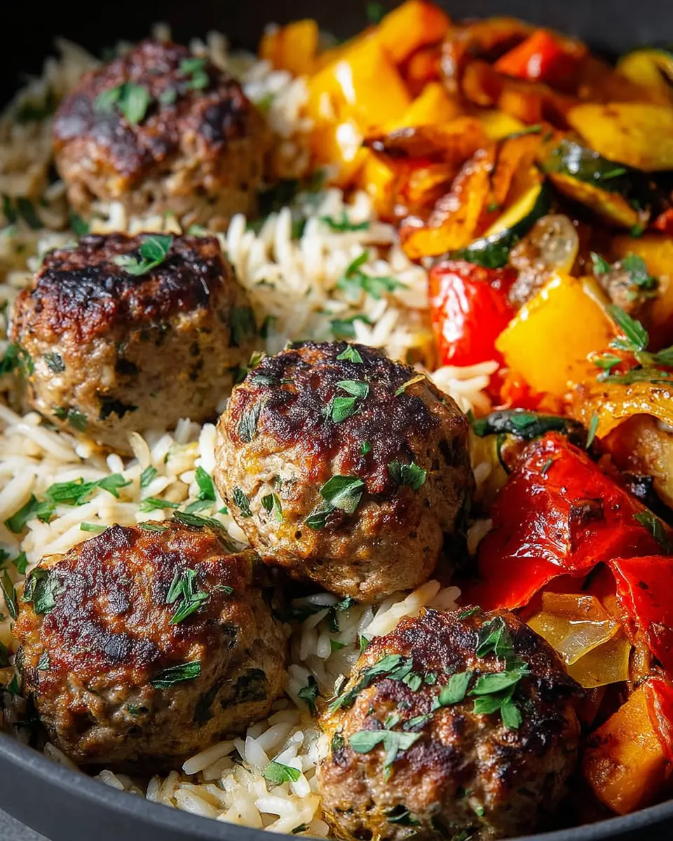 Savory Meatballs with Rice and Roasted Vegetables Recipe