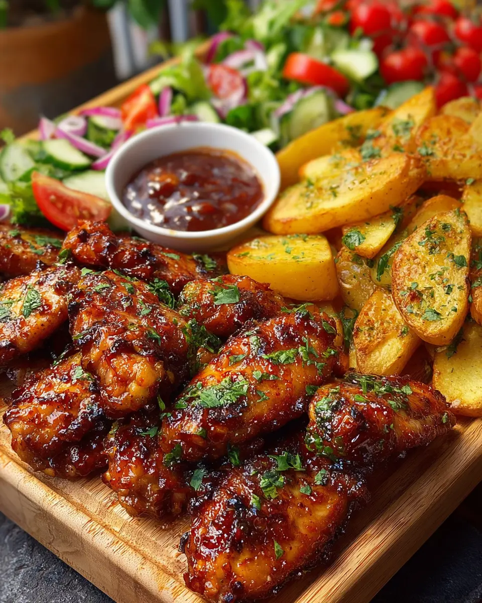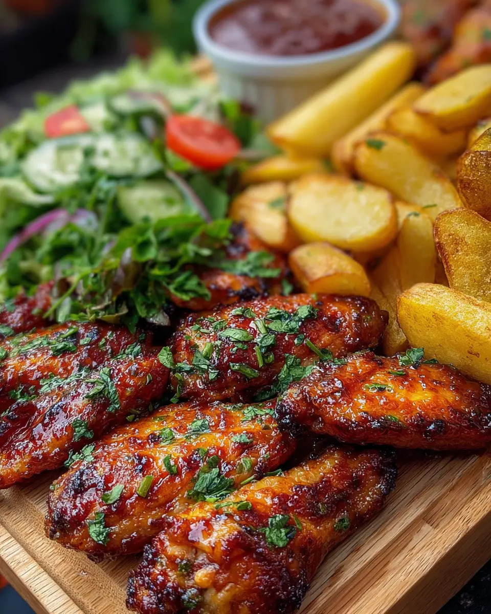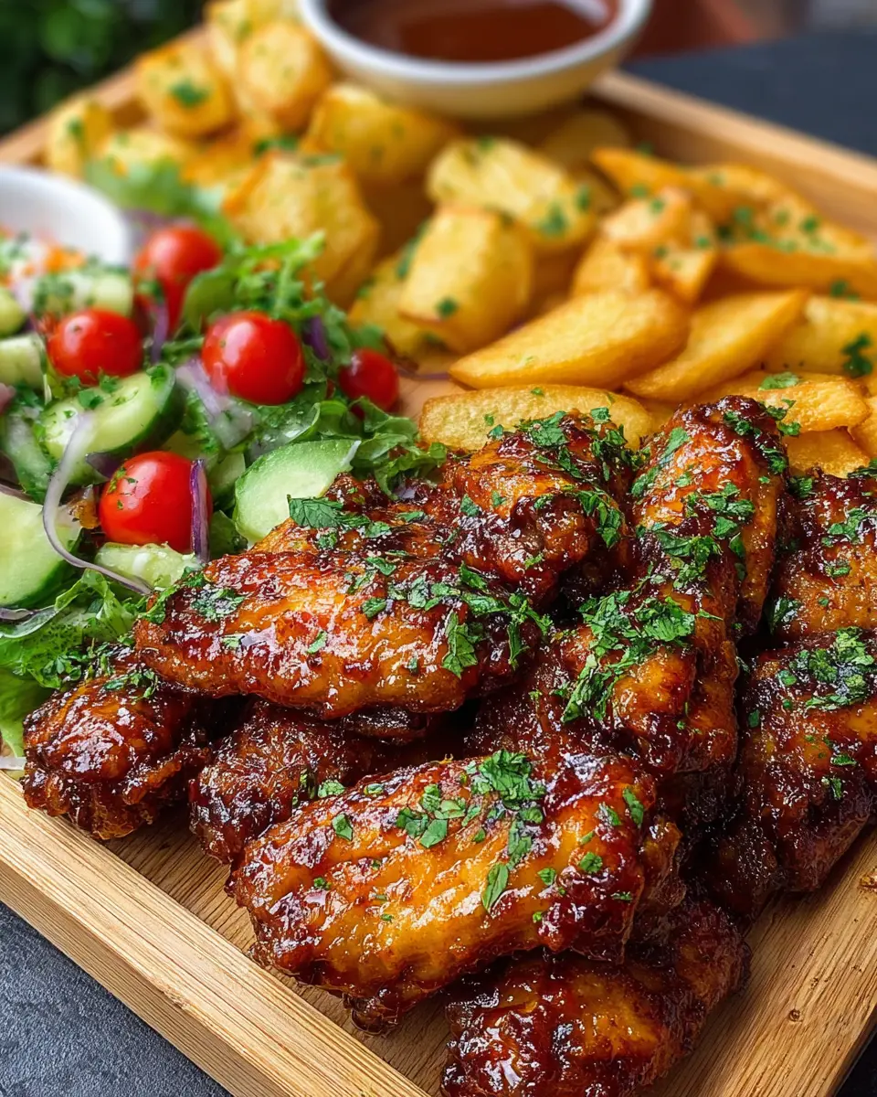 Ready to take the plunge? Let’s dive into the full recipe for sticky chicken wings served with crispy fries and a fresh salad—perfect for a weekend feast!