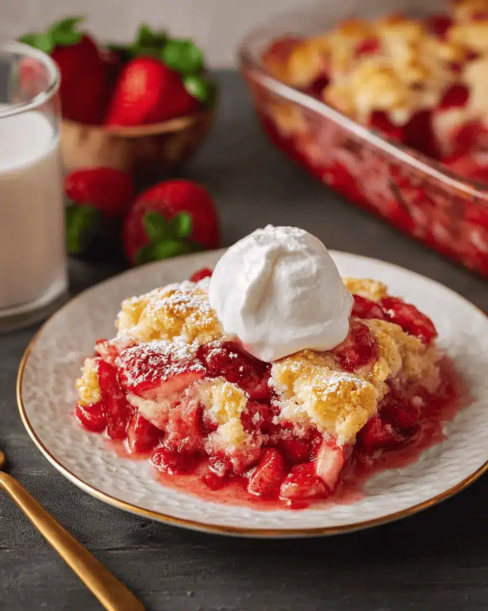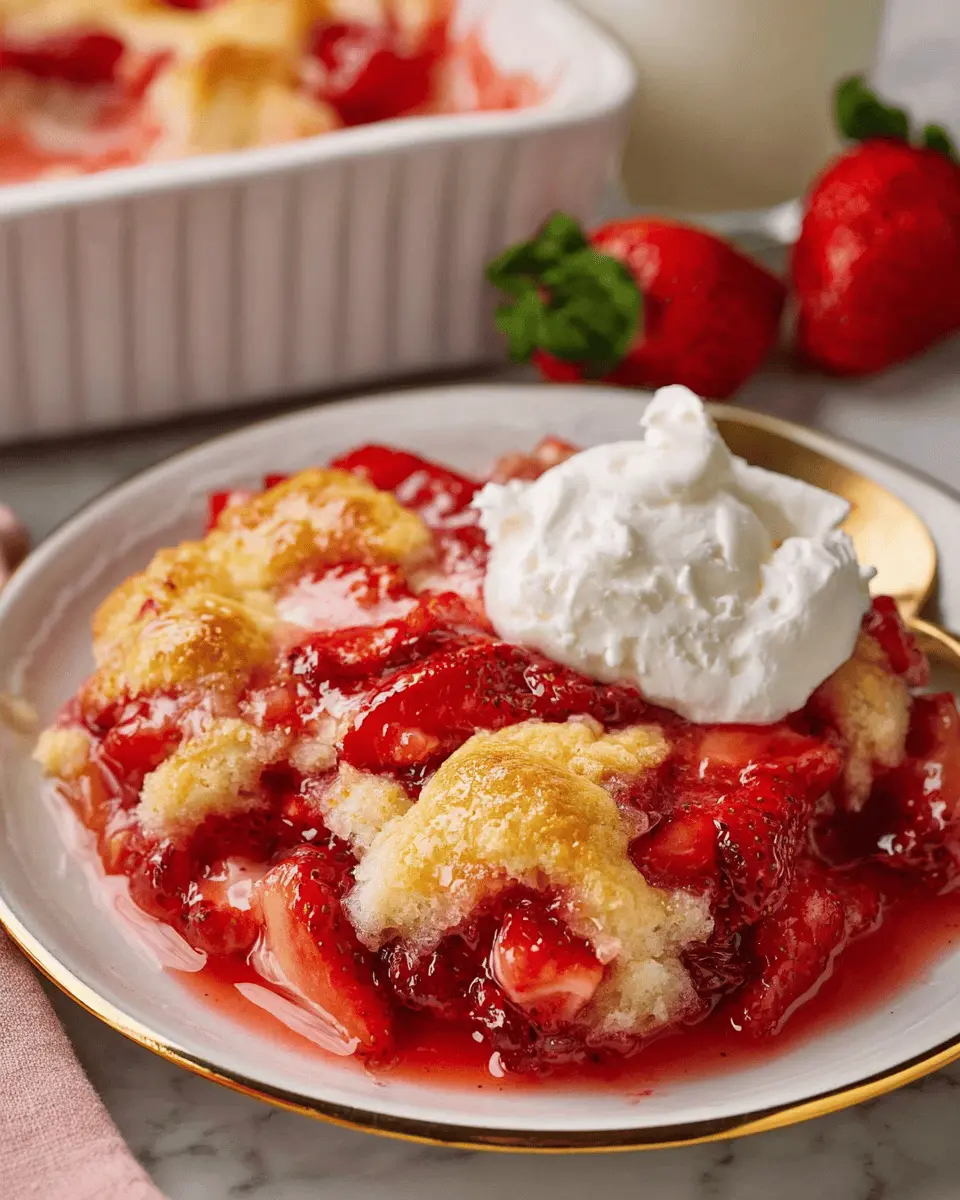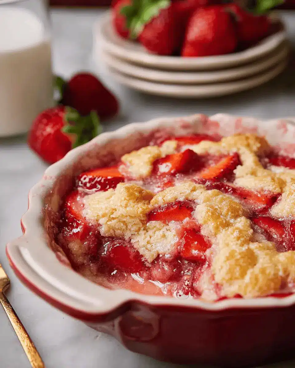 There’s something magical about serving strawberry cobbler warm, right out of the oven, topped with a generous scoop of vanilla ice cream. The creamy texture contrasts beautifully with the warm, fruity layers. Alternatively, a dollop of freshly whipped cream enhances the sweetness even further, inviting everyone dig in. For an extra touch, you might drizzle a bit of balsamic glaze or add a sprinkle of crushed graham crackers for texture.