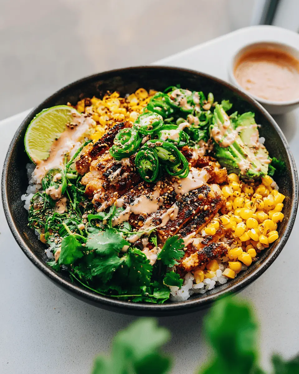 - Layer rice into bowls. Add chicken, then spoon over corn topping. Top with diced avocado and any additional toppings. Drizzle chili lime sauce generously over everything. Enjoy!