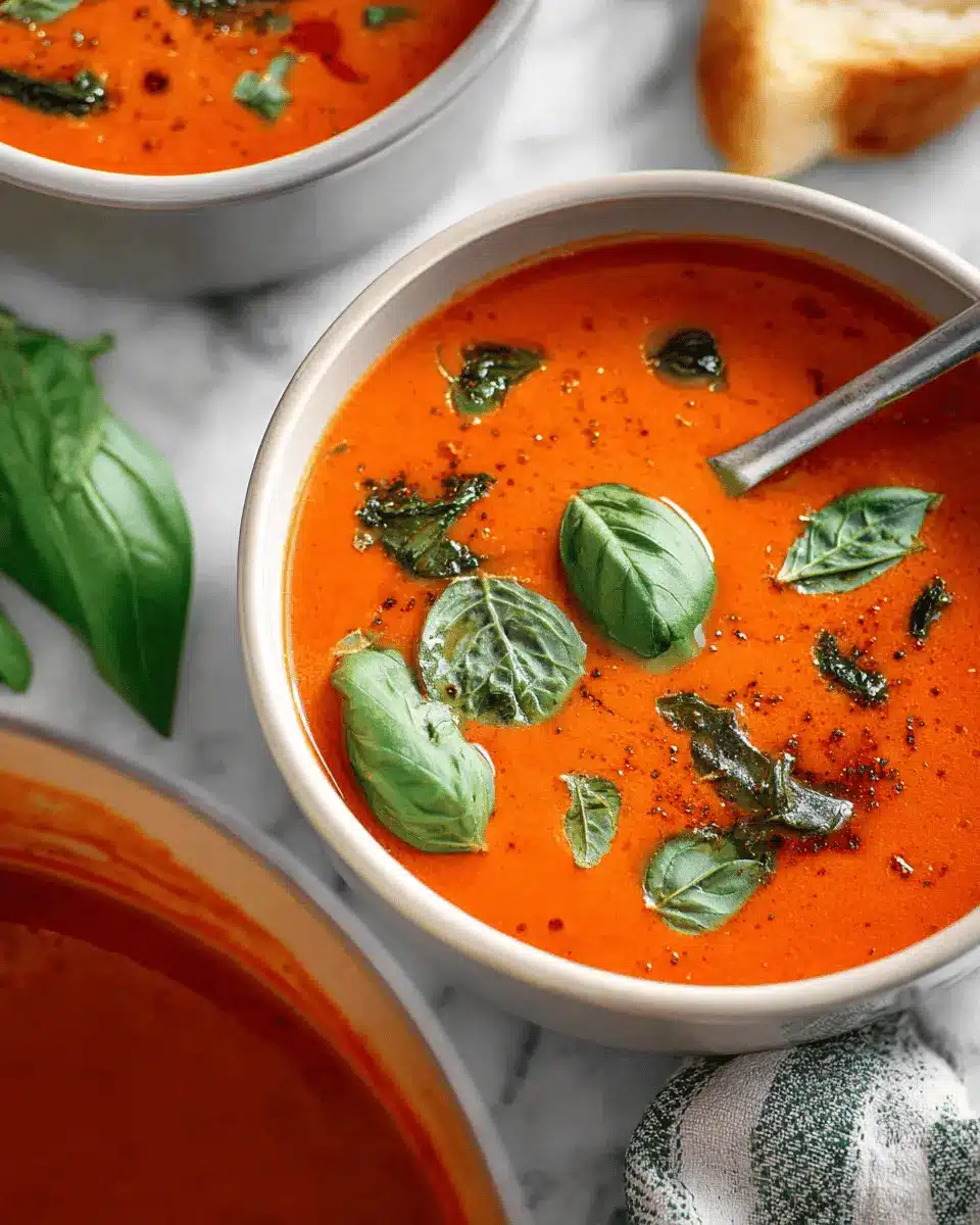 If you love heat, elevate your Tomato Basil Soup by incorporating some crushed red pepper flakes or a dash of hot sauce. For a unique flavor boost, try roasting jalapeños alongside the tomatoes. This will infuse your soup with a smoky, spicy kick that complements the fresh basil beautifully. Serve with a side of cornbread to balance the spices and enjoy a cozy meal!