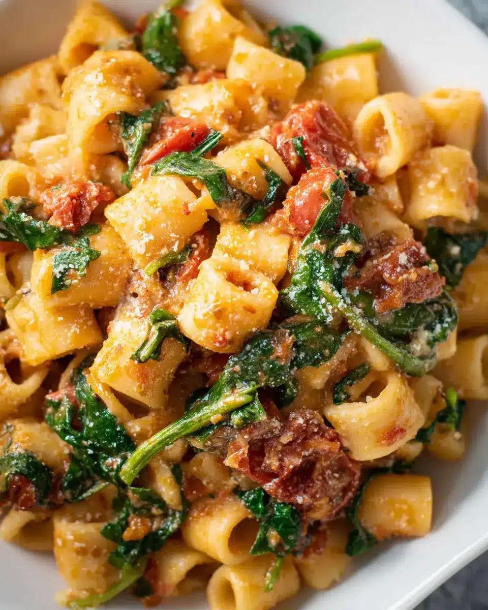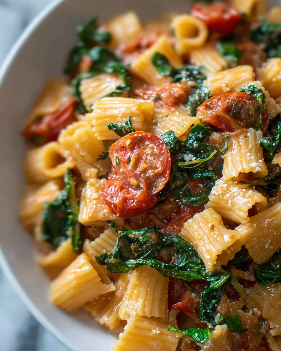 While Mezzi Rigatoni is delightful, feel free to explore! Pasta types like medium shells, rotini, or penne can also add unique textures and complement the Tomato Spinach Pasta beautifully. Opt for whole-grain or gluten-free varieties if you’re looking for healthier or dietary options. Start experimenting to find your favorite match! For more pasta tips, check out Pasta Lovers.