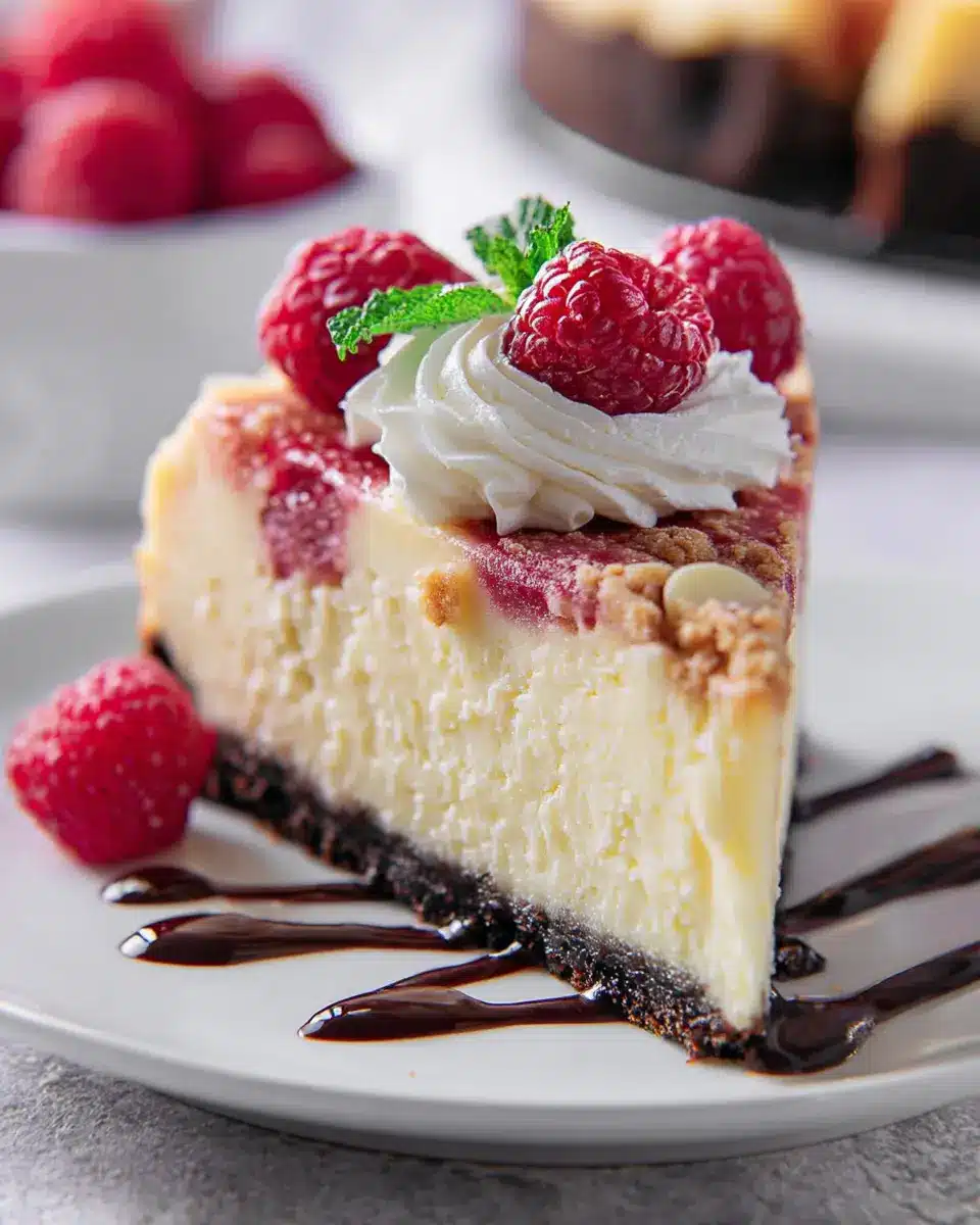 To elevate your white chocolate raspberry cheesecake, consider enhancing it with various toppings. A drizzle of raspberry sauce, paired with fresh raspberries, adds a pop of color and flavor. For texture, sprinkle some crushed Oreo cookies or edible flowers on top. You can also serve it alongside a scoop of vanilla bean ice cream or a dollop of whipped cream for extra indulgence. Have you thought about offering a complement, like a refreshing mint tea or a coffee to balance the sweetness?