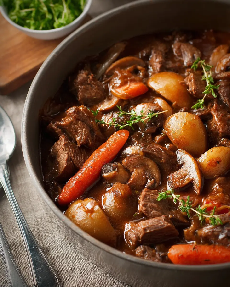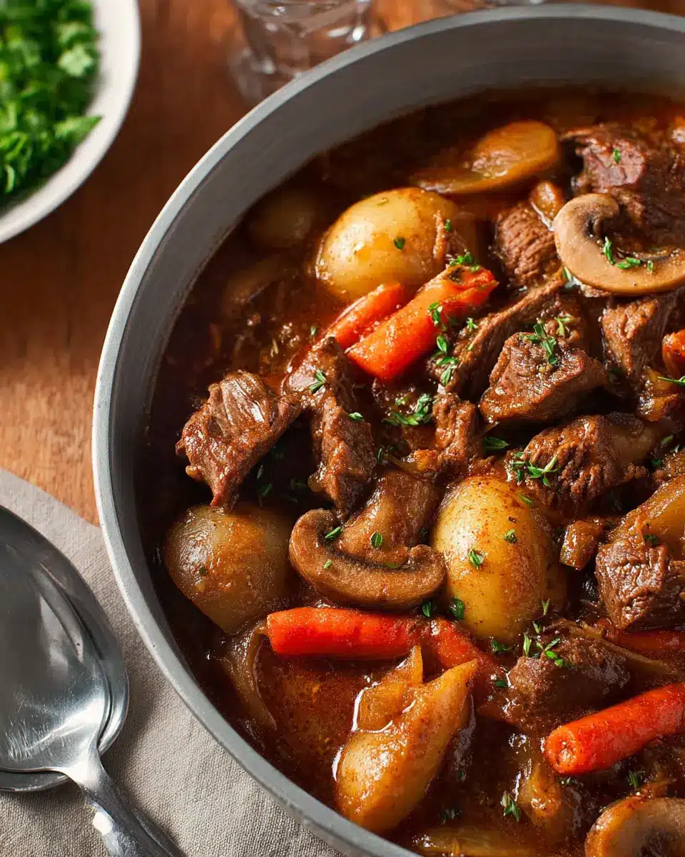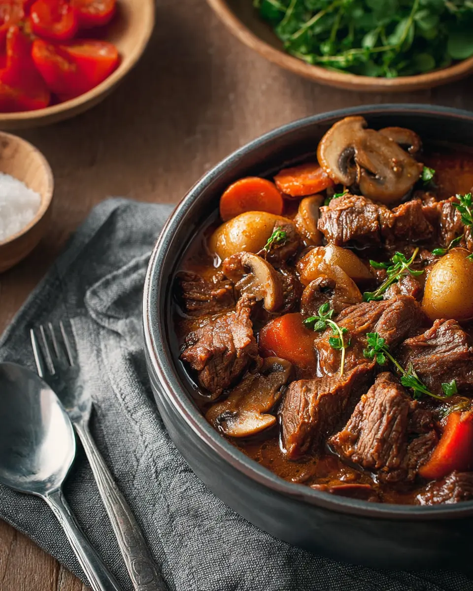 To showcase your wild mushroom beef stew beautifully, serve it in deep, rustic bowls. A sprinkle of freshly chopped parsley on top not only adds color but also a burst of fresh flavor. Pair with a side of fresh, buttered bread on a wooden cutting board for a cozy, inviting presentation. For added flair, use linen napkins and simple tableware to create a welcoming atmosphere. A perfect touch to conclude your dining experience!